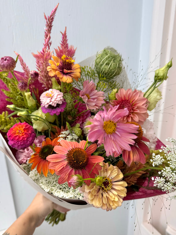 For transparency, our flower inventory changes with the seasons - we grow, harvest, and source flowers almost 100% locally. We rarely import or ship in product, setting us apart from traditional flower shops. If you're in search of a dozen roses, tropical foliage, or a potted orchid, we may not be the right fit. If you appreciate wild and whimsical arrangements, want to support local agriculture, and prefer seasonal, locally grown flowers delivered in tasteful, compostable, and recyclable packaging, we're happy you're here!